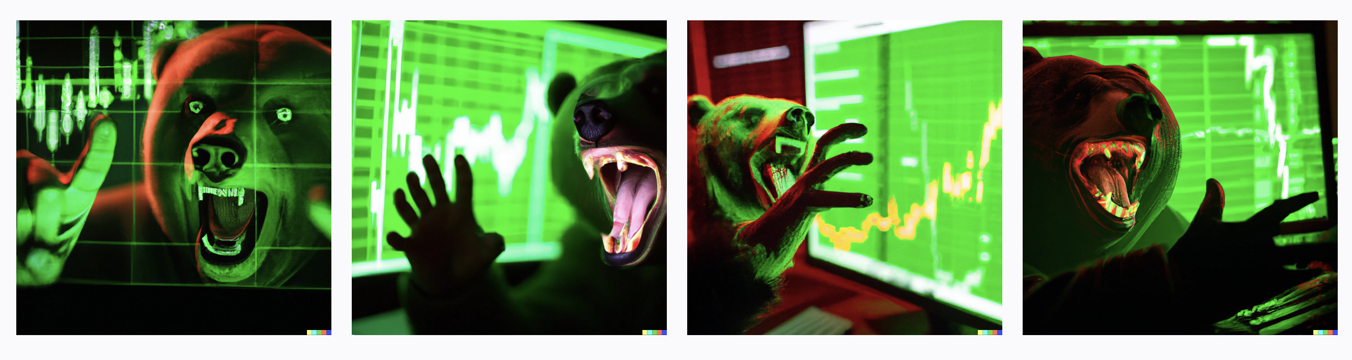 During the process of learning how to talk to it, I shared some images with one of my favorite business-oriented internet forums. The query for the second row of images was"evil bear laughing maniacally from the shadows as he hides behind a transparent computer screen displaying stocks with downwards trends in red"