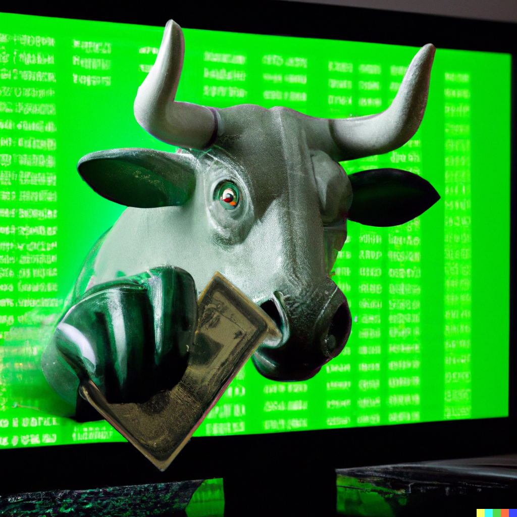 "Benevolent and charitable bull handing you dollar bills through a transparent computer screen displaying stocks with upwards trends in green"
