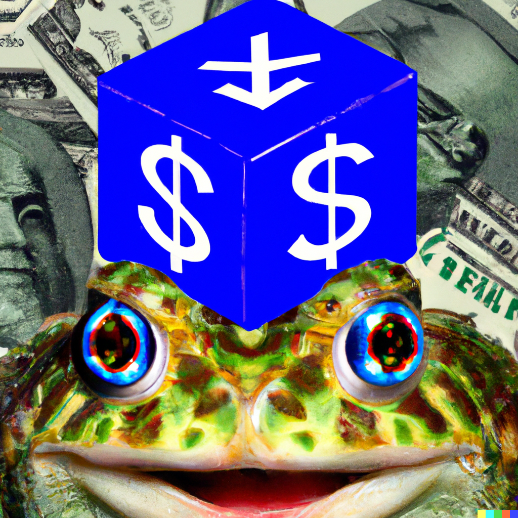 "A toad with a euphoric facial expression and dollar signs over his eyes behind a bright glowing blue arrow blasting upwards accompanied by 3 white cubes, painted by rembrandt"