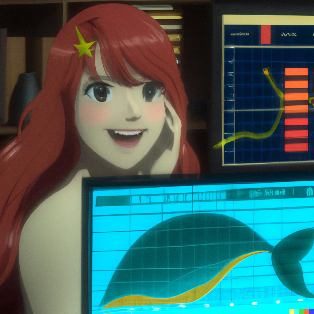 "Screenshot of an anime mermaid laughing at sales charts on a computer screen from the movie Mermaid Stock Trader by Hayao Miyazaki"