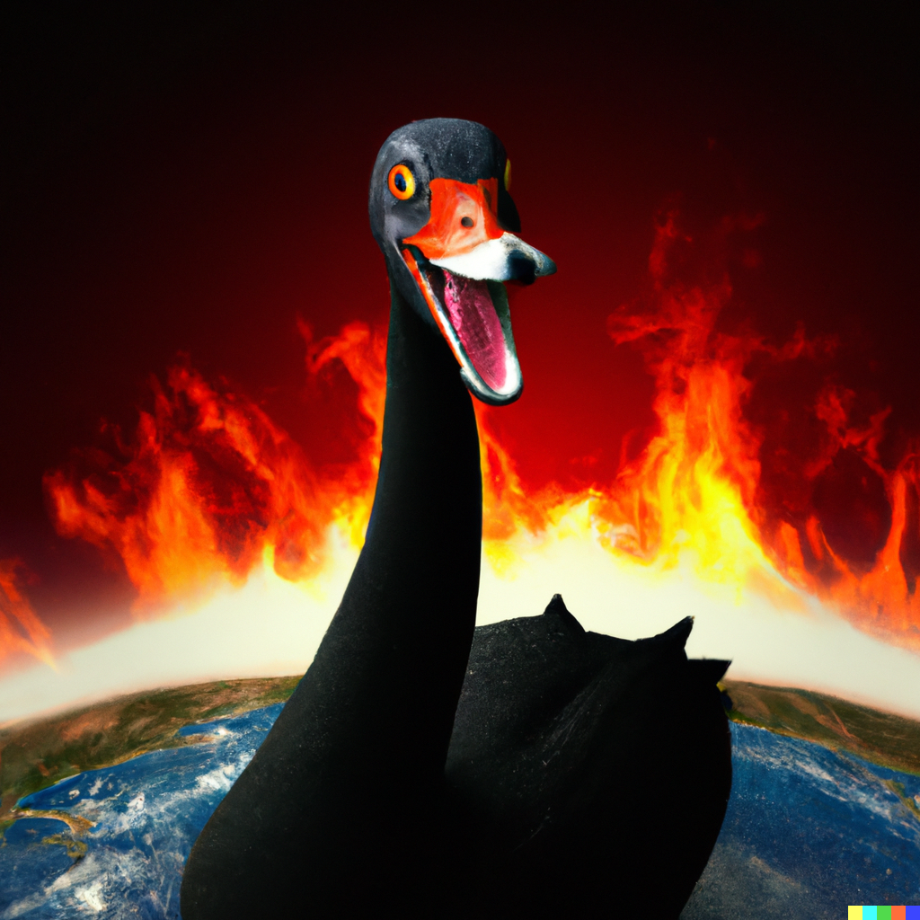 "A cartoon black swan with glowing red eyes laughing maniacally in front of a burning planet earth, cinematic photograph"