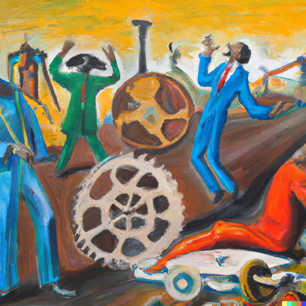 The people requested more images to be generated. Below are the best images, of the best sets of images, of the best queries people suggested. My favorite is the "Wheels of Progress" painting, that said, many of the others below are crazy good as well. Especially considering the time spent making them; Minutes, or seconds even.